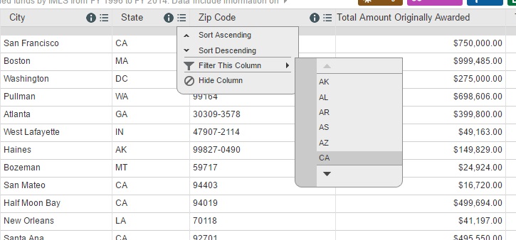 A great way to view and navigate data about a large number of grant awards is by using the Administrative Discretionary Grants dataset. For IMLS discretionary—or competitive—grant awards, the project description, dollar value, recipient, and other information from FY 1996 to FY 2014 is available in this dataset, which can be sorted, filtered and downloaded. Note: these awards do not include the more than 1,500 projects supported by the Grants to States program described above.